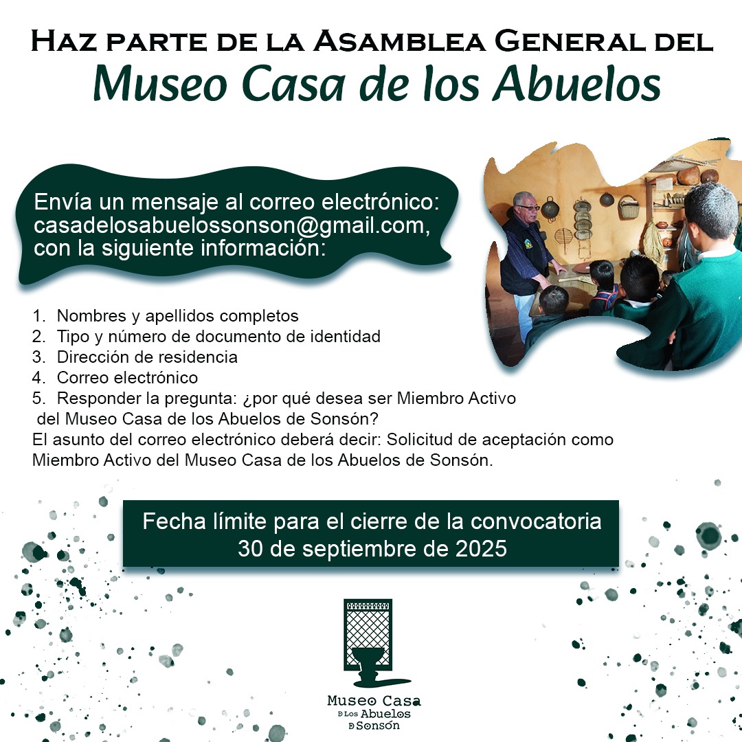 El Museo Casa de los Abuelos de Sonsón abrió la convocatoria para que ciudadanos interesados hagan parte de su Asamblea General como Miembros Activos. La invitación está dirigida a todas las personas que deseen vincularse con el museo y contribuir a la preservación de la memoria y el patrimonio cultural del municipio.